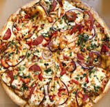 Special spinach curry sauce, fresh cilantro, red onions, fresh tomatoes & tandoori chicken & mozzarella cheese.