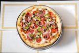 Juicy pizza combo of sausage, mushrooms, onions, feta cheese & salami. Terrific.